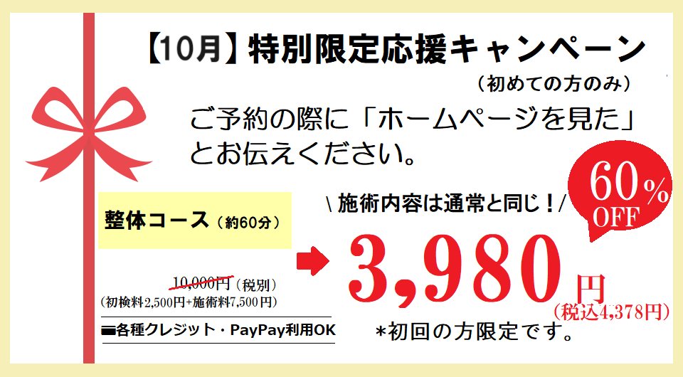 ラッキー☆整体院では土日・祝日も営業しておりますので、仕事休みの方・休日の趣味・運動後・明日から元気にお仕事をしたいあなたにおすすめです。